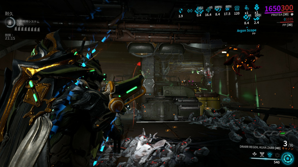 楽して鋼稼ぎたい人に、ページに上げる程でも無い攻略方法など。狩場はケレスのGABII、必要な物はPSF入り当Proteaビルド(範囲145)・鋼感染体を確殺出来る爆発武器(KUVA BRAMMA・KUVA ZARRなど)と増強(Amalgam Furax Body Count)挿FURAX(WRAITH)。場所は十字部屋の立体交差部分のここで、行き止まりを背にした状態(もしくはドア付近)でこの柱にぶっぱ。こうなる。ほぼ最大効率で敵が湧き続け、範囲11以上の爆発範囲武器であれば綺麗に巻き込め、Gloom範囲で綺麗に纏められる。作業感マッシマシですが一撃二撃で爆殺出来る武器があれば、あんまり動かず酸素効率も下がるどころかプラスになる良い狩場です。47分で10000キルに到達。