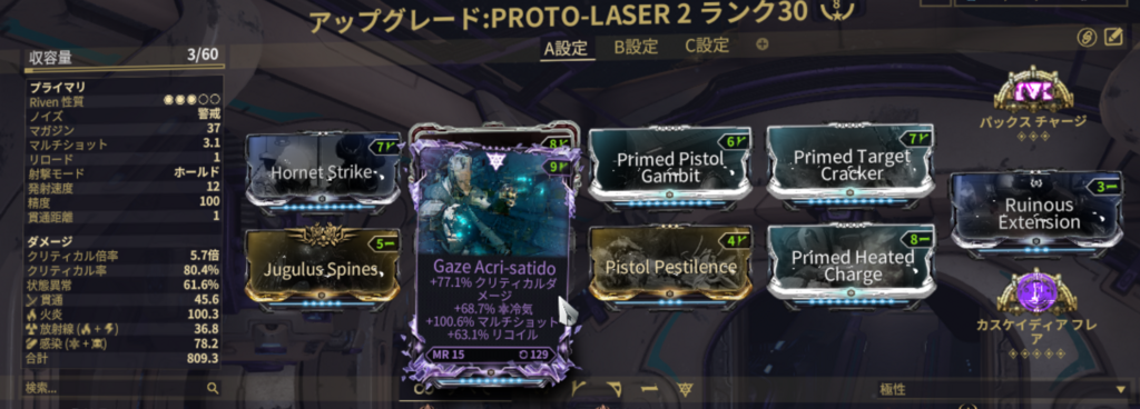短射程と長射程両方作って使ってるけど、短射程にビーム距離延長入れてるほうがメインになった、Riven込みでヌコやサイクロン超える火力になって、パックスシーカーも付けれて満足な仕上がり。