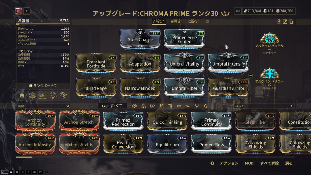 こちらのビルドにTau深紅の威力を五本装着して、火属性ライトカラーのごくシンプルな自己バフCHROMAとして運用しています(右下の不一致は増強実装前にビルドを組んだ時の名残です) UMBRA極性3つは愛やこだわりの領域なので、1,2箇所に留めておくのが無難かと思います。かなり趣味に寄ったビルド幅の限られる構築となってしまっているため、あくまで一例としてお考えください💦