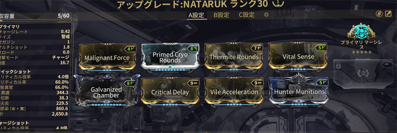 基礎ダメ クリ率 クリダメ 弾速 60火炎 亜鉛マルチ ハマショ PShred Vigilanteマルチ。多分改善の余地はいくらでもあるけど、プライマリアルケインや腐食、感染異常が乗ってなくても高レベルOW依頼の輸送船を安定して叩き落としたり鋼グリニアを正面から潰せるから今の所はこれでやってる。
