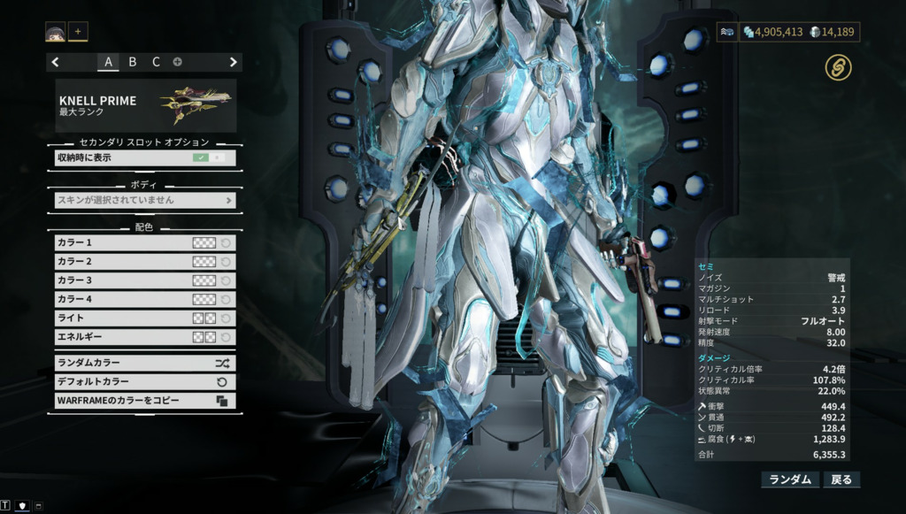 発射速度+1.0、クリ倍率+0.5、クリ率+20%、異常率+5%、基礎ダメ+30(衝撃+12.6、貫通+13.8、切断+3.6)ヤケクソじみた強化な上に加え何故かRiven極性も最初から☆4