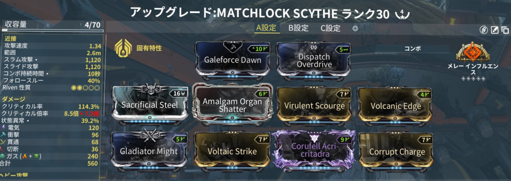 Riven持ってないので真面目に作ってはないけど、STROPHAより遠くまで届くので初期コンボある程度入れてヘビー極振り運用が良いんじゃないかな 異常率は低いけど、無限貫通で複数体巻き込めるから爆発orガスインフルでも楽しそう あと、フォロースルーがハンマー並にきっついヘビーサイスの通常攻撃にはコンボ溜め以上の価値は無い 少なくとも単体を殴るなら手数とクリ性能でゴリ押しできなくもないけど、集団相手のダメージソースとして見るのは諦めた方が良い