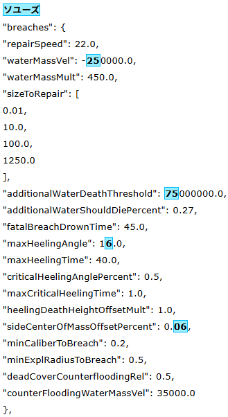 見つけた。大和、アイオワ、ソユーズの"breaches": {}の中のwaterMassVel(Velocity?)とwaterMassMult(Multiplier?)を比較してみて欲しいんだけど、大和が一番値大きいのが原因じゃね?