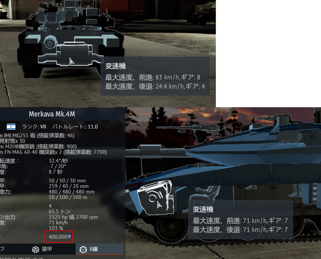 同ステータスは所有している車両が表示されるのは元より(画像上)、未所持の車両でも確認が行え(画像下)、また改造による変化はない(空と異なり最高速に変化はない)ため、実測をせずとも記載する事が可能なステータスかと思われます。実測の条件が厳しい(舗装地が続くマップで検証するのが厳しい+条件がない(?))のも鑑みますと、一律に記載が可能なこちらに統一も手かなと個人的には思ったりもします。この方式でしたら無理なく埋めることも可能ですし、実装直後から記入も可能ですし。ですがテンプレ系議論の為厳密な検証と意見交換が必要になりそうです