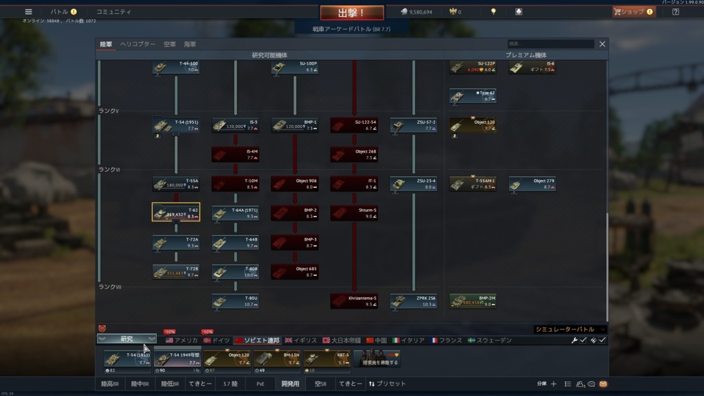 今回のBR改訂で以前にT-62開発すれば2両飛ばしてこいつ開発できるようになって嬉しい