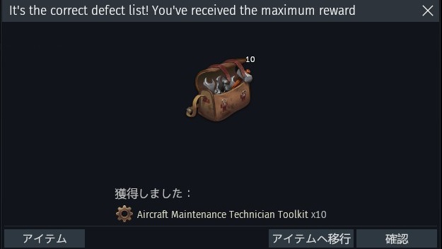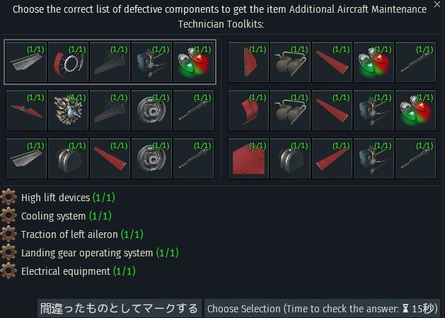 テストフライトを初めて外観のチェック。今回は左エルロンの破損とフラップが展開しっぱなしが確認できる。 しばらくするとエンジンが止まり再起動できないので燃料タンクの異常を確認。 選択肢を見ると、フラップがあるのは二つのみなので二択になる。さらにそこから、左エルロンと燃料タンクがあるのは左下が正解だと考えられるので解答。 そして無事正解でボーナスゲット!