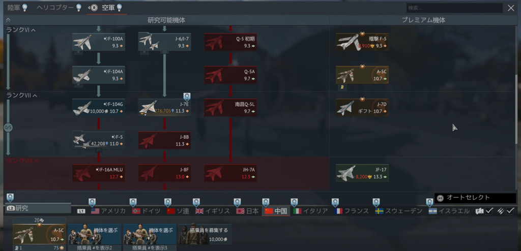 開発メインなら我慢してJ-7Dが良いと思う。F-5Eみたいにしばらく放置されるかもしれないし。A-5Cは最近使ってないから分からんが、戦ってるとだいぶ餌になったと感じる