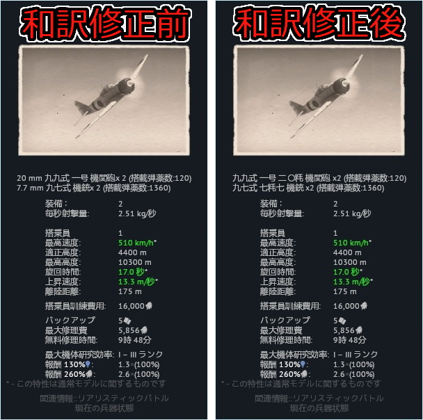 unit.csvでも日本語設定用の機体名が一部略称表記になってたりしてるあたり、ちょいちょい変更がある模様。(零式水上観測機→零式水観、九六式艦上戦闘機→九六艦戦)他にも、(九六式艦上戦闘機→九六式艦戦 羽切松雄搭乗機)とか