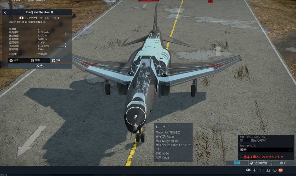 そりゃEJのままだよ。だってこれ中身EJのファイルコピーしてとりあえず動くようにしただけだもの。ここから重量が増えて改修項目が変わって武装(主に爆弾)が増えると思われ。新ミサイルはまずないだろうね。あと恐らくEJからは爆撃照準なくなるから爆撃で改修してる人とかは注意