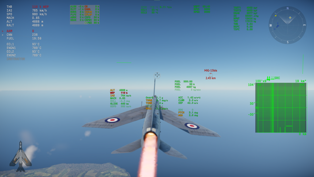 中高度以上だと全力旋回でも6G限界で速度ゴリ削れなのでマズ回れない。側面急襲は気づかれるとヘッドオンになるリスク、背面は追い付けるくらい速度乗せるころにはターンされて追従できない、てのがパターンかな。敵機が運よく気づかずたまにキルチャンスが巡るくらいで常に受動的。104は高速域だと機敏だからやりようあるがlightningは全速度域でもっさり。AoAが高くて慣性で引き摺られるのも慣れが要る。red topは空気抵抗導入で死人に鞭打ち状態で1.5km@4000m側面からでも剝がされる。速度も1000m以下ではM1.0良いとこで4000mでやっとM1.2が出る程度だから良くある10.3マッチで速度をウリにし辛い。ロケットフレア出来ない。FCS無くて対地し辛い。