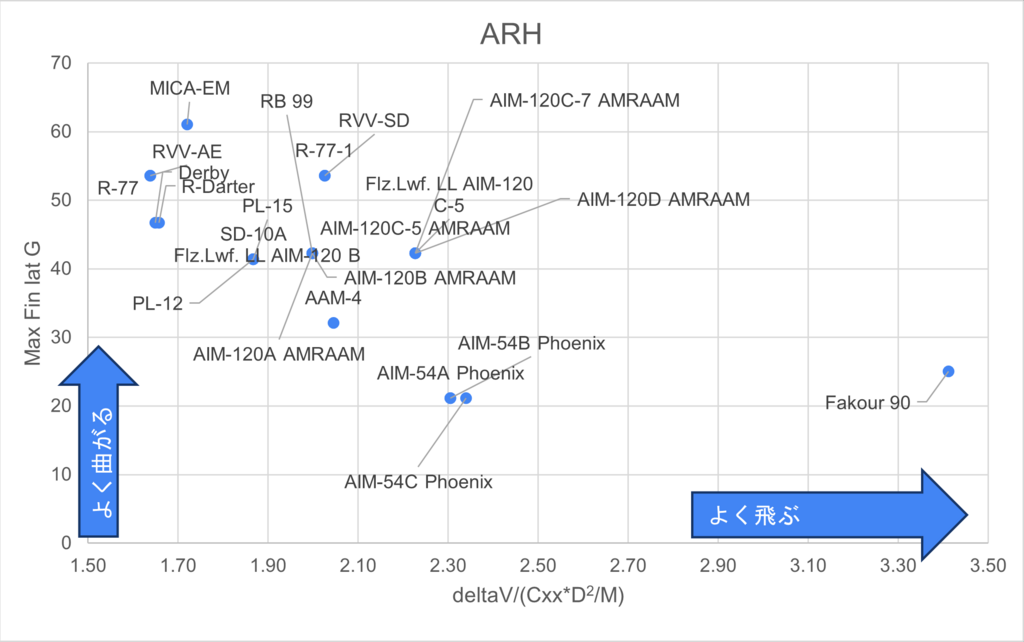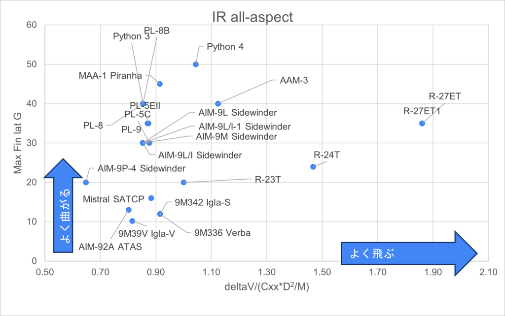 Su-30MK2のページで東側ミサイルわからんというコメ読んで、久々にミサイルデータシートグラフ化してみた。DeltaV/(CxxCxk*D2/M)はデルタVデカくて重いと大きい値になって、Cxxや直径がデカいと小さくなるので、デカい値だとよく飛ぶ=(長射程or早く届く)なイメージ。縦軸は単純に旋回Gだな。イメージと合ってるORココが合わないみたいな意見ある?