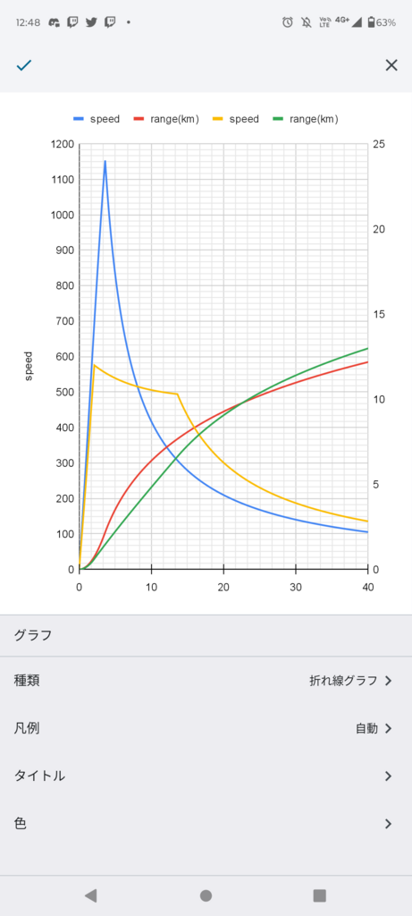 まああくまでそれっぽい計算ってだけだからね。とはいえ両者CxKは同じで太さが2ミリ違う程度だから大きくずれてはいないと思うよ。ただちょっと効果が検証できてない数字があって、もしそれが関係ない数字だったら追い抜きタイミングは発射から30秒、14キロぐらいになるはず。なのでまあもし実験できる人がいたら並べて同時に撃ってリプレイからどんなもんか見るとかしてもらえると検証になってうれしいけど(このスプレッドシート自体は自分のお遊び用なので
