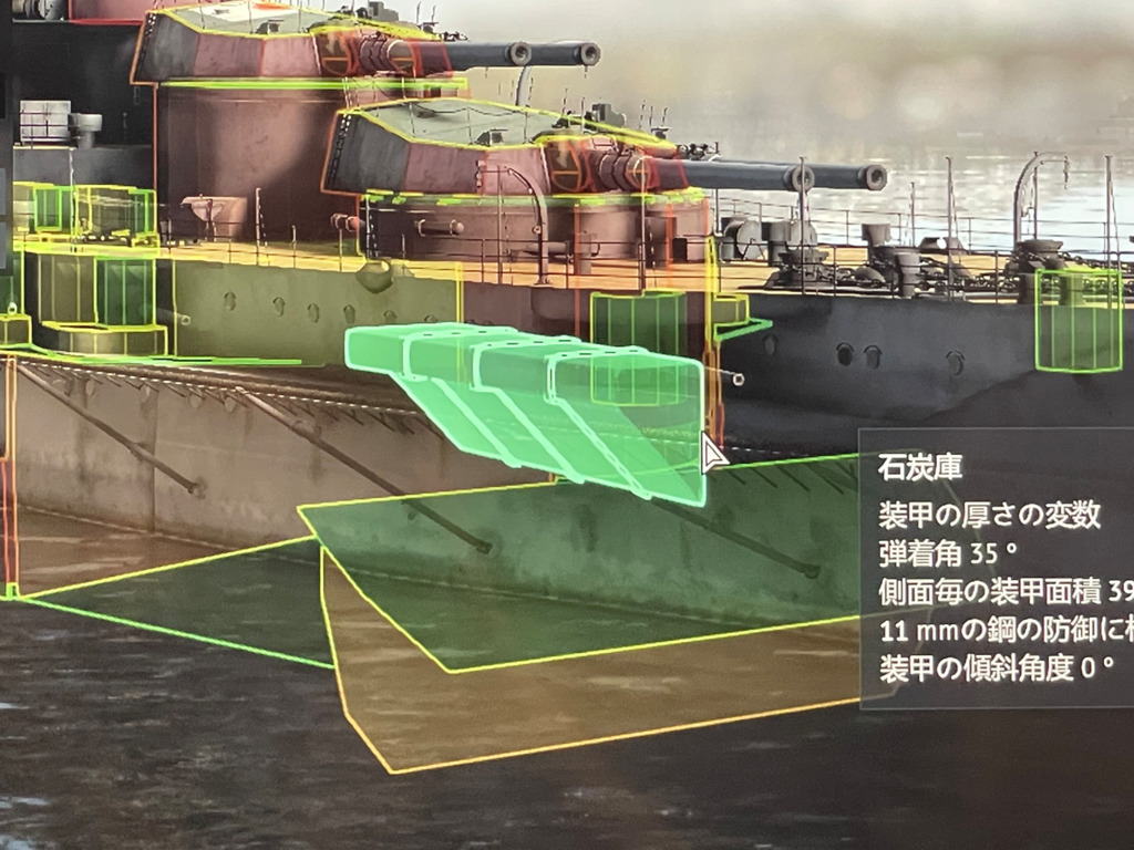こいつアプデ前は真横負けたら薄い100mm部分を貫通されて爆散だったのに、今は相手に対して正面や背面を向けたら、傾斜部分が死んでそこを貫通されて弾薬庫が飛ぶって言う、扱いが180°変わって難しい… 今も癖で敵になるべく艦を立てちゃう
