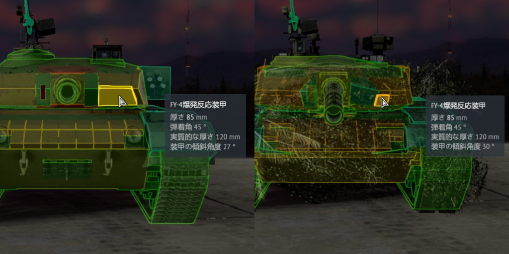 X線で見た時の表示はバラバラだけど装甲表示の外部装甲表示で爆発反応装甲を同じ角度で見た場合96Aも99も全く同じですよ。