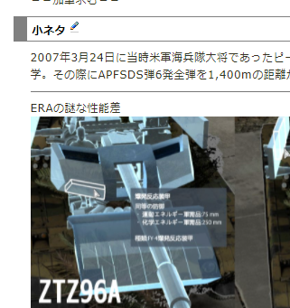 まぁ90式のページで中国の話が出ていたのでそちらに乗って議論を拡張させたのは申し訳ありませんでした。しかし「頭が欠如している」「理解していないでしょ」などと言われる覚えはありませんしこちらが煽るようなこともしておりません。話を戻しますと「設定の手間」を考えた場合に最も適切なのは「ERAを装備状態に拘わらず純粋に性能を表記する」だと思いますしゲーム内でもそうなっていると私は最初からそう主張している(空間云々はあくまで「装備状態を考慮している」と仮定した際の話)ので別段おかしな話でもないと思うのですが。