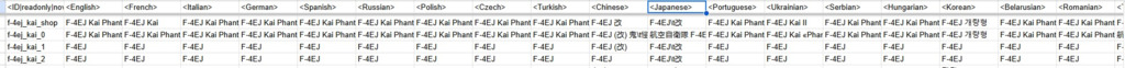 lang¥units.csvで日本語列見てみたら?1機体あたり名前が4つあって、デッキ表示名、スタットカード表示名、機影表示名(遠方)、機影表示名(近方)のどれかがEJになってるんでね?