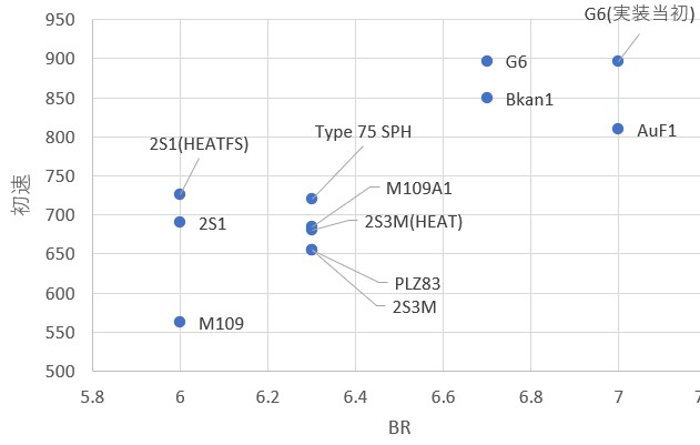 いやー、大口径榴弾砲全体を通して初速高いと強い前提で実装してるんじゃないか感がね。グラフ化してみると2S1が仮説をぶっ壊してきたけど。