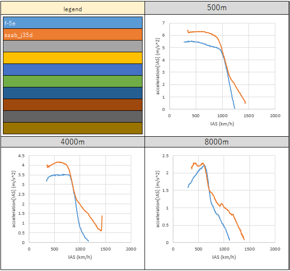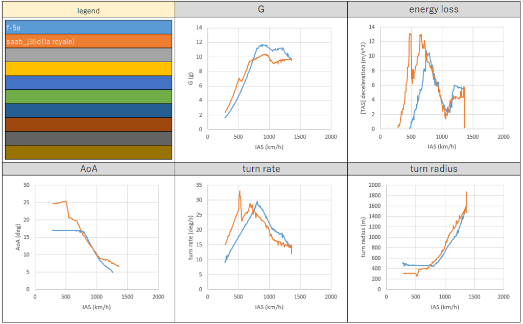 そこそこ使っての感想。全速度帯で10G以下しか曲がらないので中速域以上の旋回は並以下。エアブレーキは効きが悪い上、展開するとピッチが効かなくなるため1サークルの押し出しが苦手。超旋回を出せる700kph以下調整しようにも、加減速率の悪さと低速域のエネ保から速度調整は至難となり2サークルも難あり。一撃離脱機としての運用がメインだけどkfirで良いやとなる機体だな。F-5Eと比較すると800kph以上で旋回率・旋回半径・エネ保全て負ける不遇