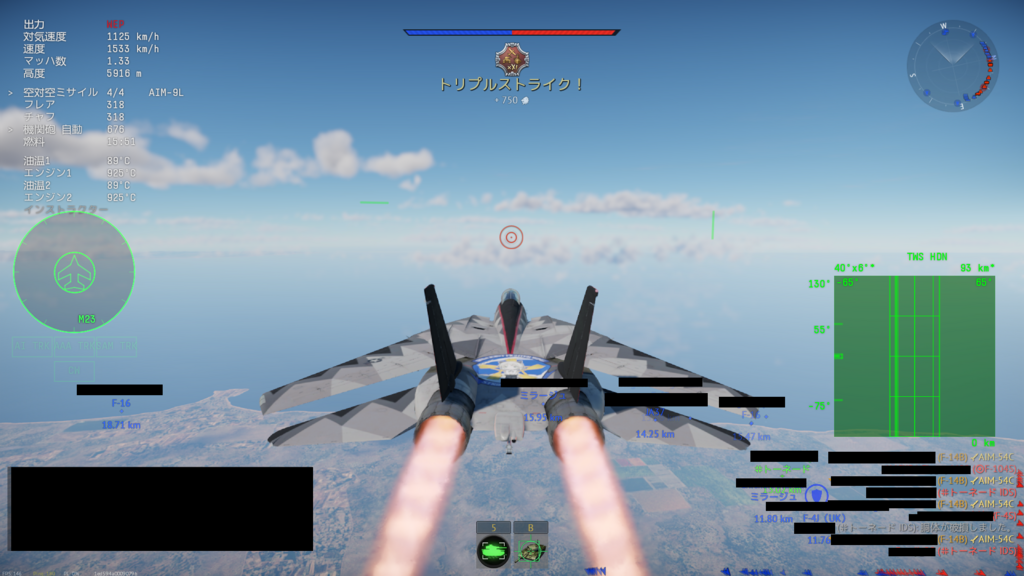 開幕上昇して高度5000mくらいで前からもF-14のロックが飛んでくるけど自分がTWSで見てる限り先頭の敵機ですら30~40kmなのにレーダーで見つけたからってロックするのか?ってなってる。後ろからは遊んでるのかも知れないけど