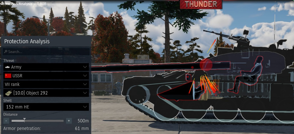 防護分析をよーく見ると分かるけど砲塔正面は抜けなくて,葉1が言う通り操縦手ハッチを突き破って爆風が車内に吹き込んでる.obj292持ってないと防護分析はできないが,2S1とかの他の大口径榴弾でも同じことが起こるから試してみ.