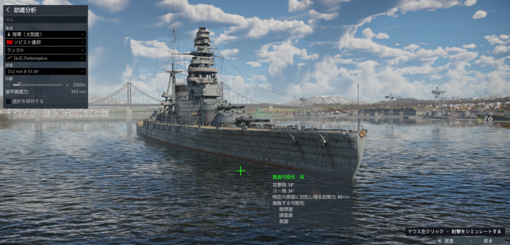 艦首の水線下が2インチの垂直と3インチ水平装甲しかないっぽいからここに水中弾が入り込むと簡単に爆沈するっぽいな、側面は傾斜してるからいいけどここは垂直でどうしようもないし60°くらいで戦ってた方がマシかも?