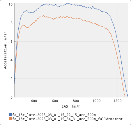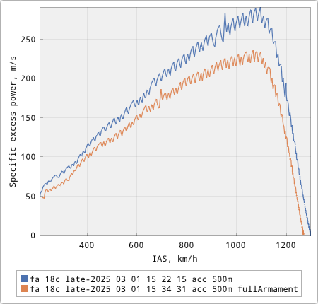 《F-18》Yak-141に似た性能。M1.0以下ではACC:10m/s^2, SEP:250m/sと流石のパワー(F-16C同等)。M1.0以上では造波抵抗が極端に大きくなるが高高度なら割と容易にM1.2-1.4へ到達可能。双発機らしく高高度でのSEPの減少が他の単発機連中(F-16,MiG-29,JAS-39)と比べて緩いのでBVR適正が無いとも言い切れない(LERXらしく誘導抵抗が大きすぎて旋回時の減速が大なので無理か…?)。フル兵装時は加速上昇性能は約20%減するが、それでもM1.0以下に限ればSu-27やJAS39、Mirage2K同等以上ある。
