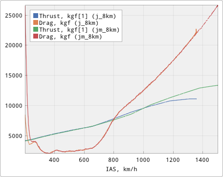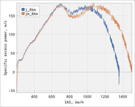 F-15Jより高高度性能良くなってるのな。エンジン出力が高速域でも伸びるので高度8kmならJがM1.8が限界、JMはM2.06まで伸びる。上昇力も最大値は180m/sで変わらないけどJMの方が高速域でも高い。ちなみにJ/A/Bazは全部同じ、JM/CMSIP/BazMeshuparは全部同じだった。