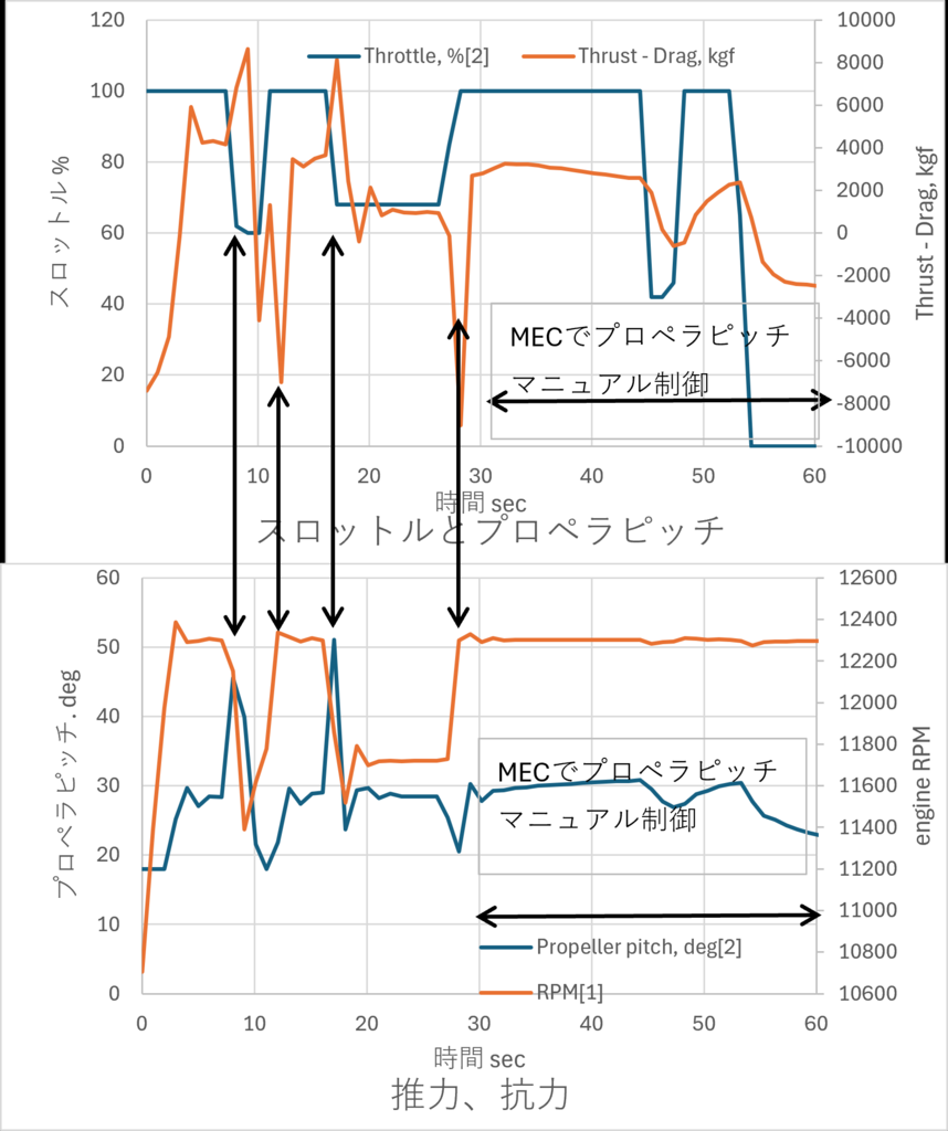 雑なデータ取りになったけど、やっぱりプロペラピッチだよこれ。スロットル下げたタイミングでペラピッチが30→50degくらいに飛ぶし、MECでペラピッチマニュアルにすると現象がなくなる。予想するにエンジンの内部抵抗がすごく弱く設定されていて、ペラピッチ使って強制的に遅くする操作をしないと回転数下がらないんじゃないかな。ペラピッチマニュアルだとスロットル下げてもRPM下がらなくなるし。
