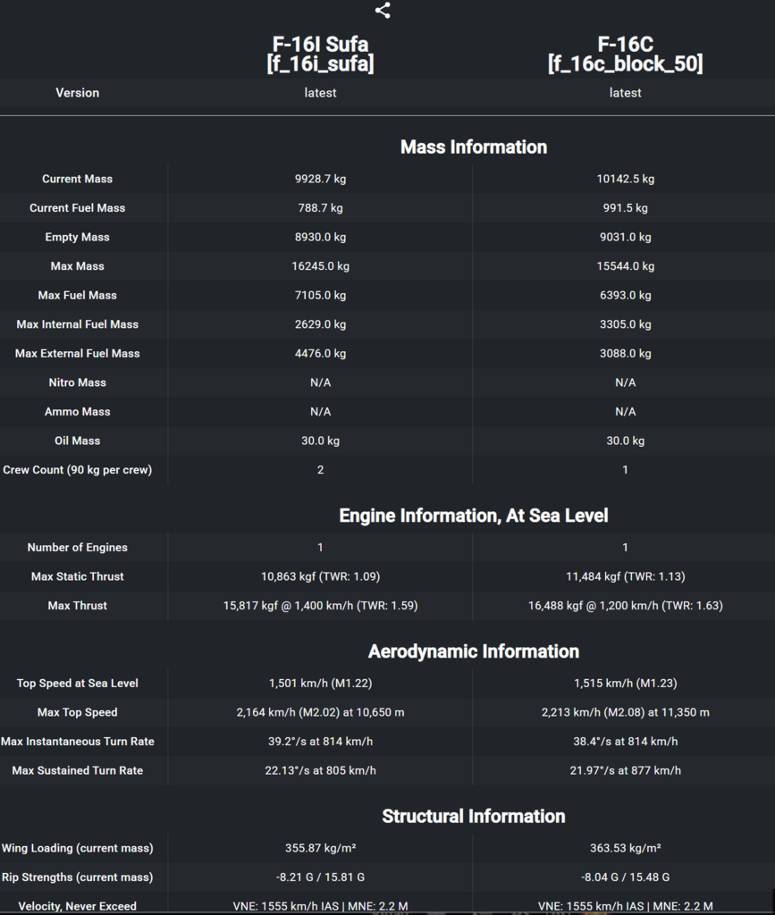 Sufaの乾燥重量、複座バラクIIより軽いのか。というか複座バラクIIより重い単座block50は一体なんなんだ…?意外とF-16AMの性能良いな。