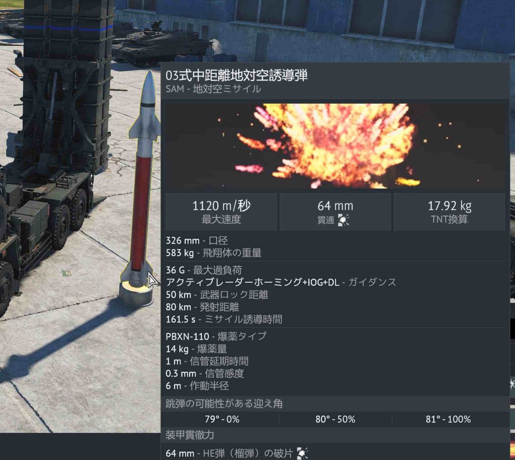 巡航ミサイル(低空目標)や空対地ミサイル(高速目標)への対処能力が上がってるらしいけど詳細は不明、低空目標用の補助レーダーがあるけど「メインレーダーと発射機が2機」な今のwarthunderだと出せないと思う。ミサイルの直径が細くなってるから空気抵抗は減ってると思うけど、重量が100kg以上減ってるのが気になる...重量を考えたら射程は据え置きか、もしくは少し短いかも...?