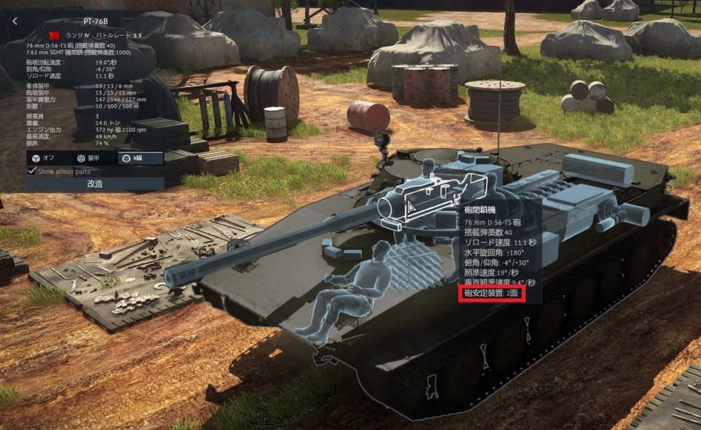 枝1が書いてるけど一応詳細に。X線で砲閉鎖機にカーソルを合わせるといろいろ表示され、スタビが搭載されていれば一番最後に「砲安定装置」って表示される。2面ってのは垂直と水平って意味。シャーマン系とかごく一部「垂直」のみスタビがついてる車両もある