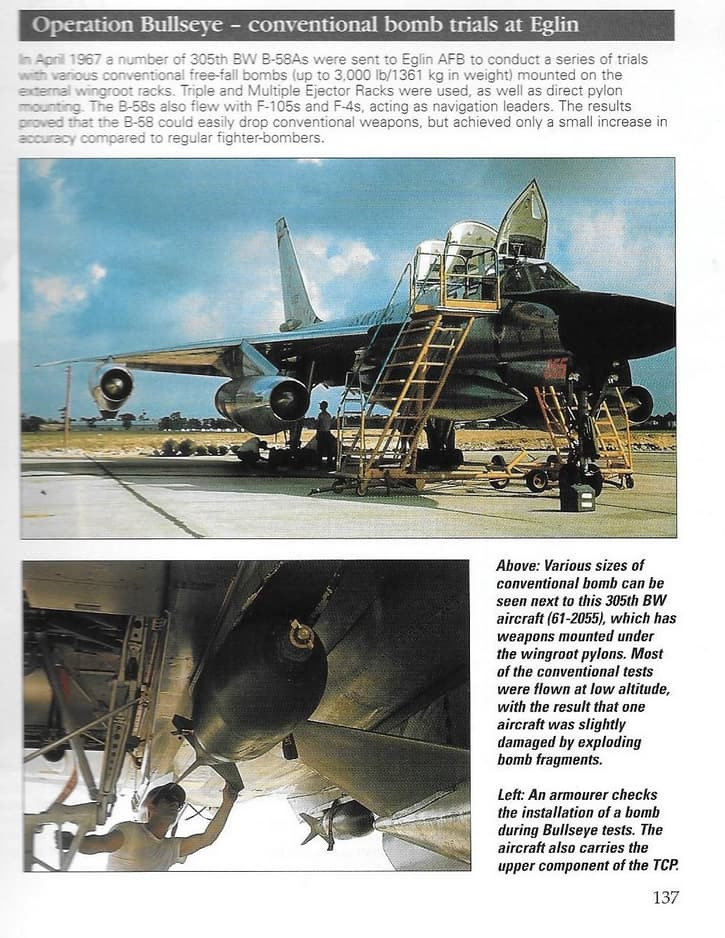 通常爆弾を搭載する実証実験は行われてるよ。合計9000lbまでの通常爆弾を搭載できる4箇所のハードポイントを追加した"ブルズアイ計画"は成功してる。全身燃料タンクみたいな機体設計は核攻撃などの特殊作戦以外で使うにはリスクが高いとして実運用はされなかったが。実装提案も出てるよ。