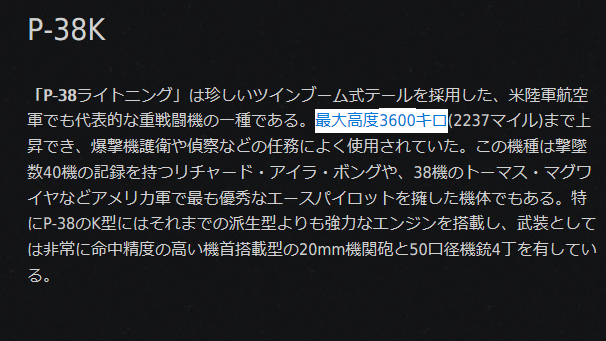 もう木主と分隊でロッテ組みたい程ですわ。P-38Kの隠れた魅力が高高度、例えば8000mならスロットル80%でIAS450km/hくらいの高速巡航が可能燃料20分で出たとして25分以上飛行できてしまう。