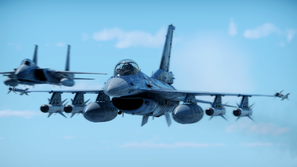 一度に目に入る武装の数と情報量が多くて見辛い。真正面から搭載量がある画を見せたいのなら、翼下のAGM-65をGBUか増槽に変えて情報量を減らして欲しい。