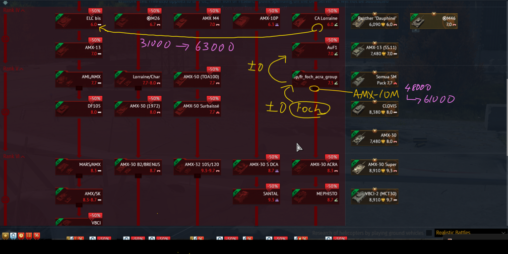 手書きで悪いがフランス陸がDEVで図のように位置とRP変更がかかる模様、アップデート時に即時適用の可能性があって一部必要RPが増減するので自分みたいにこの辺開発中の人は注意(特にELC bis開発しておくと左ツリーがランクIVのショートカットになるので人によっては重要そう)
