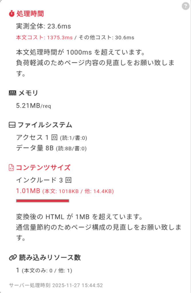 現在、このページに対して「コンテンツサイズが1MBを超えている」という警告が出ている状態ですが、どのように対処すれば良いのかが分かりません。