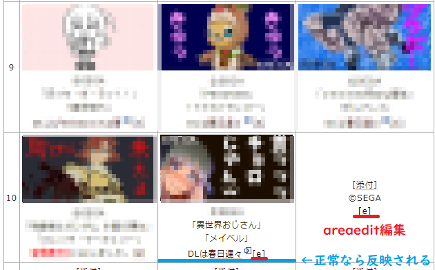 areaedit編集([e]を押してから編集する場所)から文字をいれて「ページの更新」をしても反映されません。 areaedit編集内には記載したものは残りますが本来の部分にはその記載されたものが反映・表示されていません。