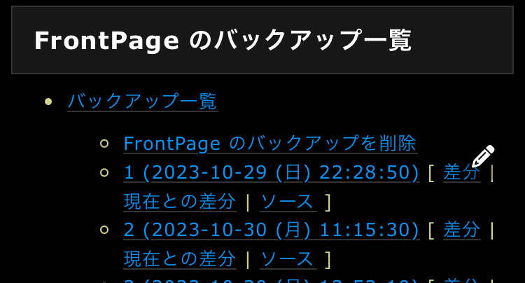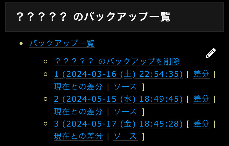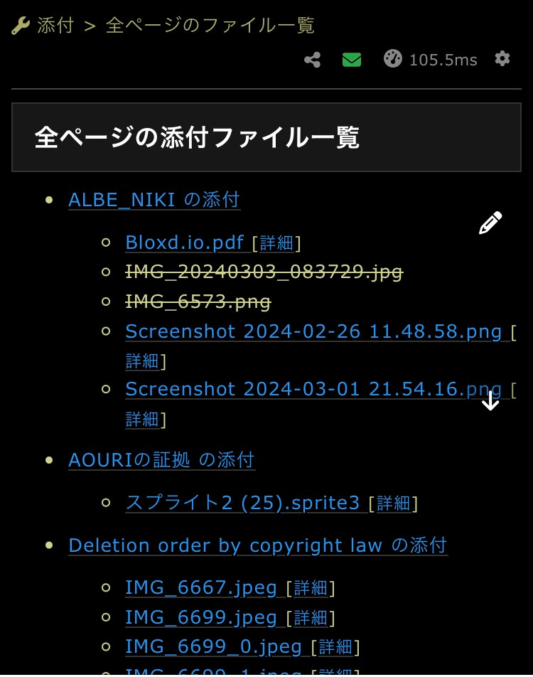 「全ページの添付ファイル一覧」にある訂正線が引かれたファイルは削除されたものの、バックアップにファイルが残っています。また、現存していないページに添付ファイルが残っている場合があります。