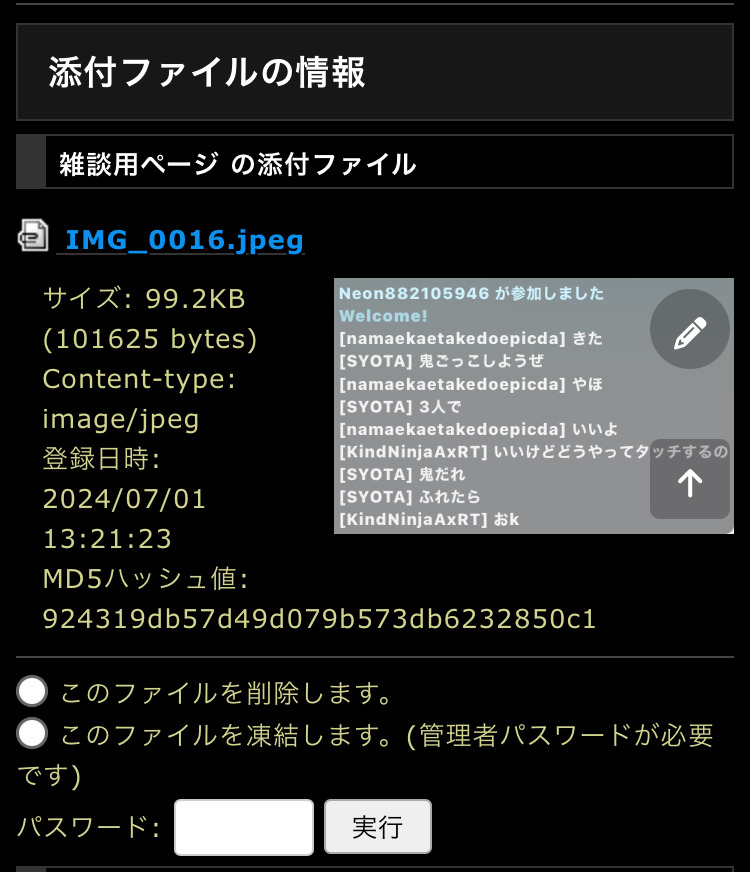 ⑥どのページに添付されているファイルなのかが表示されます。必要なければ、「このファイルを削除します。」を選択して「実行」ボタンを押します。パスワードの入力は不要なので管理人、副管理人でなくとも誰でも可能です。
