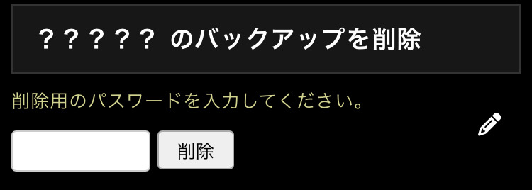 ⑤ 「削除用のパスワードを入力してください。」とあるので、管理者パスワード(管理人のみ)を入力して完全削除になります。