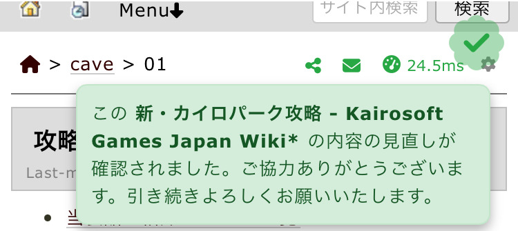 「cave/01」にだけ、画面右上にレ点マークが表示されます。その他ページは見当たりません。運営さんから該当ページおよび、Wiki全体の内容を見直しするように指示をいただいていない認識でいます。