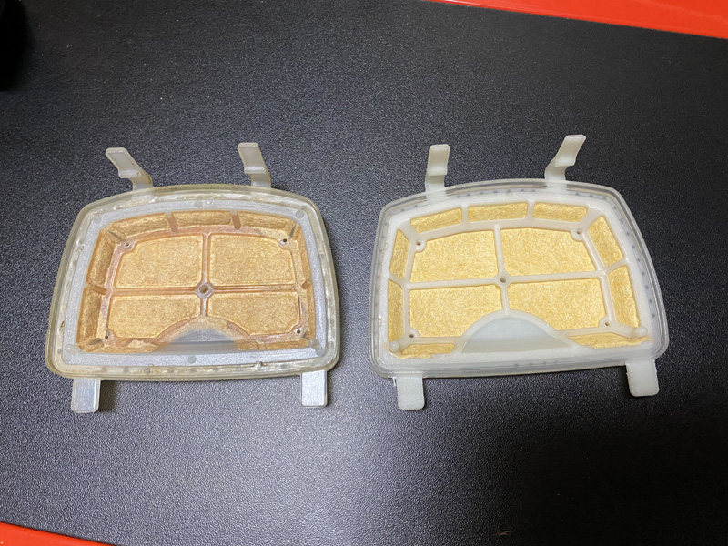 左がそれ、右が後日改めて購入した純正品。ぱっと見は同じですが、左はフリースの吹きつけ?や細部の処理がアバウトです。それ以上に、嵌合が甘いんだと思います。フィルターの意味ないですね。