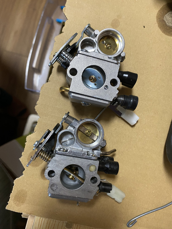 なんともったいない!!原因が違った箇所にあったとは! 僕はキャブレター周りをいじる自身はないですね。 僕のはStill MS170cですが、先日オイルが全く出なくなりまして、目詰まりだと思っていたんですが、オイルを抜いて灯油などで何度洗っても復活せず。。。結局分解してみて、まずは綺麗に清掃から始めましたが、ひどい汚れでした。 で、原因はホースの目詰まりかと思っていたんですが、オイルをポンプアップする箇所が、経年でずれていたんでしょうか。一度外してハメ直すと、無事復活しました。 素人ができる調整って、意外に少ないかもって思いました。 僕も含めて素人は「あまり難易度の高い場所は手をつけない!」のが鉄則ではないでしょうか(笑)