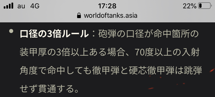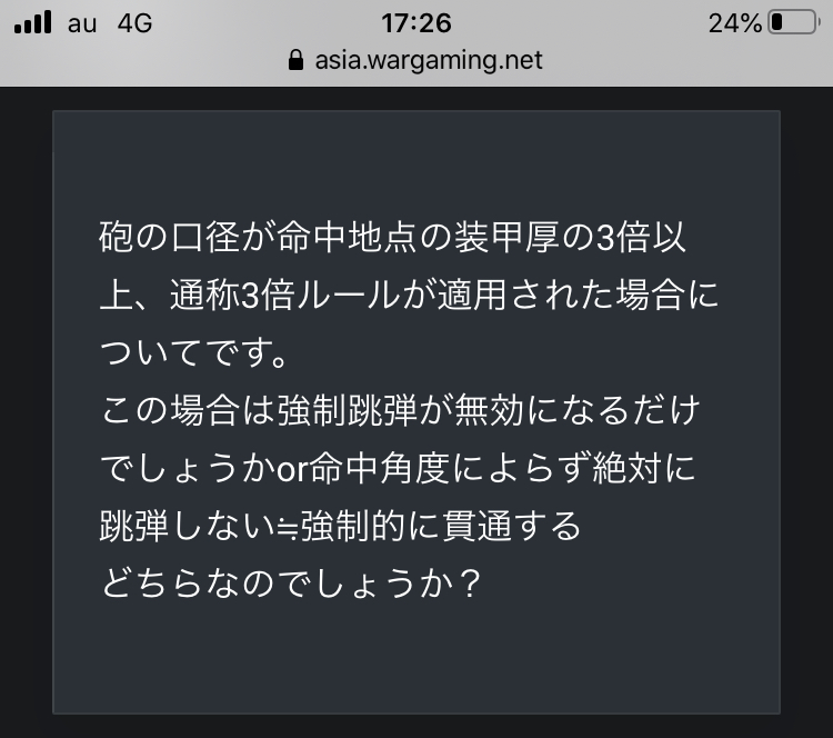 質問主が核心に迫る聞き方をしているにも関わらず、回答を濁している運営(たぶん回答担当者も分かってない)。結局ビクトリアの記事のURLを貼っている。その記事では強制貫通するとはどこにも書いてない。↑312さんが書いてる通り、3倍を超えると角度による跳弾判定が無くなるだけで絶対貫通できるとは言ってない。つまり砲弾の持つ貫通力が見かけの装甲厚を超えない限り(当たり前だが)貫通する訳がない。