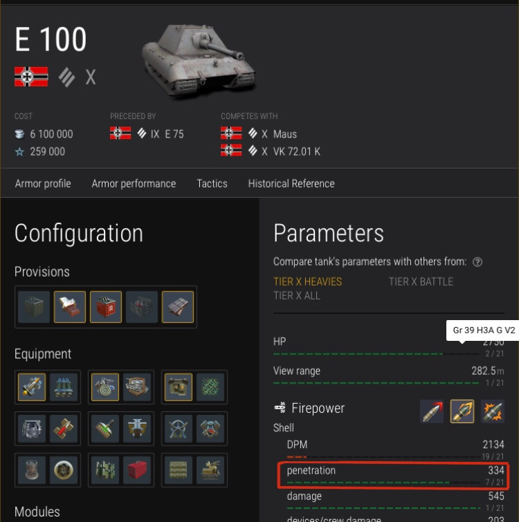 課金弾貫通が低いって言われてるけど、HEATだから貫通上げ載せれば333mmにもなる。画像の通りBlitzhangarだと1mm高い334mmが緑バーで同格HT中7位の値。つまり333mmは"中の上"で十分な貫通力があるのがわかると思う。DPM200弱犠牲になるけど、DPMは元から高いから2628と十分あるし貫通上げがおすすめ。