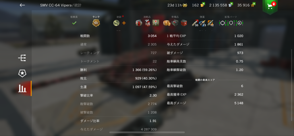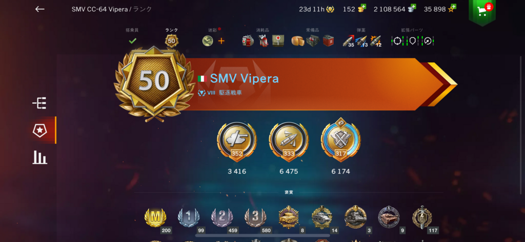 箱から出たので使った見た使用感。見た目は初期砲塔に大トロ仕様。装甲厚は砲塔と車体正面はツリーのCC64より薄め。1番の違いは攻撃面。CC64が320×3発に対しViperaは400×2発。単発運用をした場合、Viperaの方が打撃力がある。弾倉撃ち切り時の初段装填は20秒。CC64よりは3秒ほど早い。機動力は大きな違いなし。