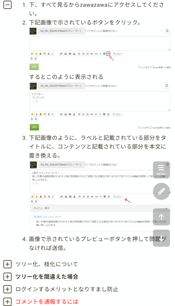 車輌ページのコメント欄の上に注意書きが載ってるので、それを参考に畳んだ形に編集すると良いです。自身のコメントの日付を押すと編集画面にいけますよ。