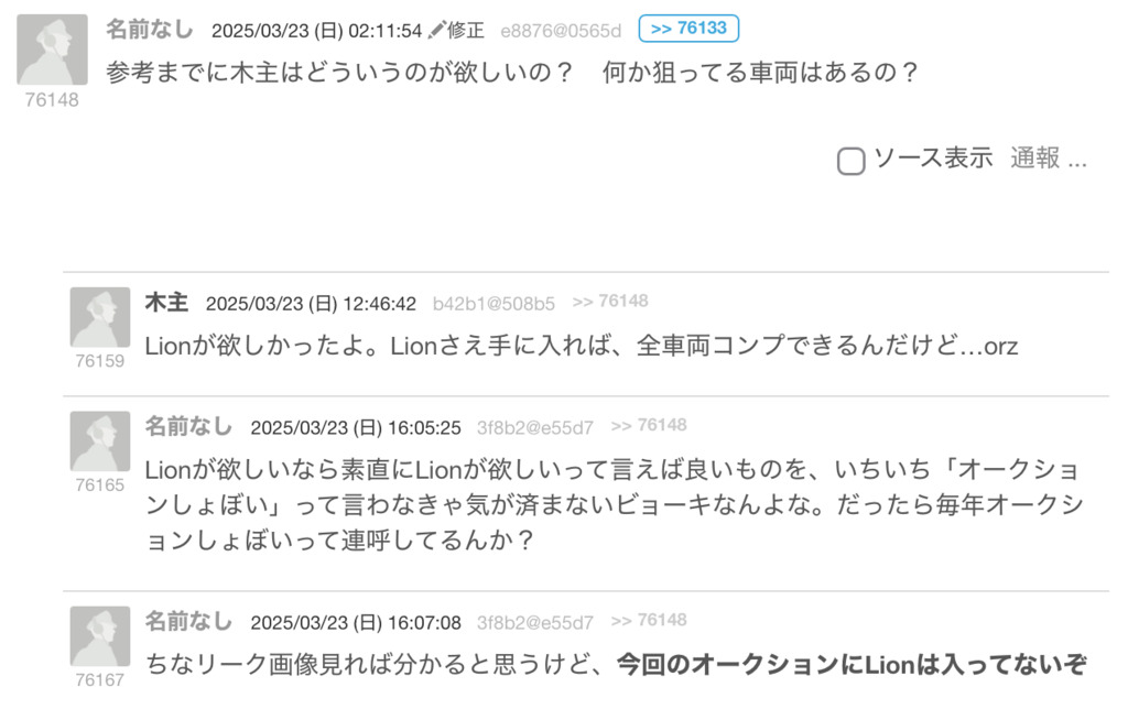 ショップの車両のことについて書き込むと、毎回のように『Tier降格でゴミになる云々』と書き込む方がおられます。掲示板の空気を悪くするだけなので、対処していただければと思います。(同一人物なのか私にはわからないので…