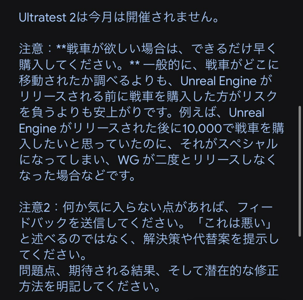 ウルトラテストのセットと現在の開発ツリーでは、開発済みのガンやエンジンへの取り扱いにより、高ディア車両の大幅値上げとなる。避けて欲しい旨、英訳して、refoged test discussionに書き込みました。