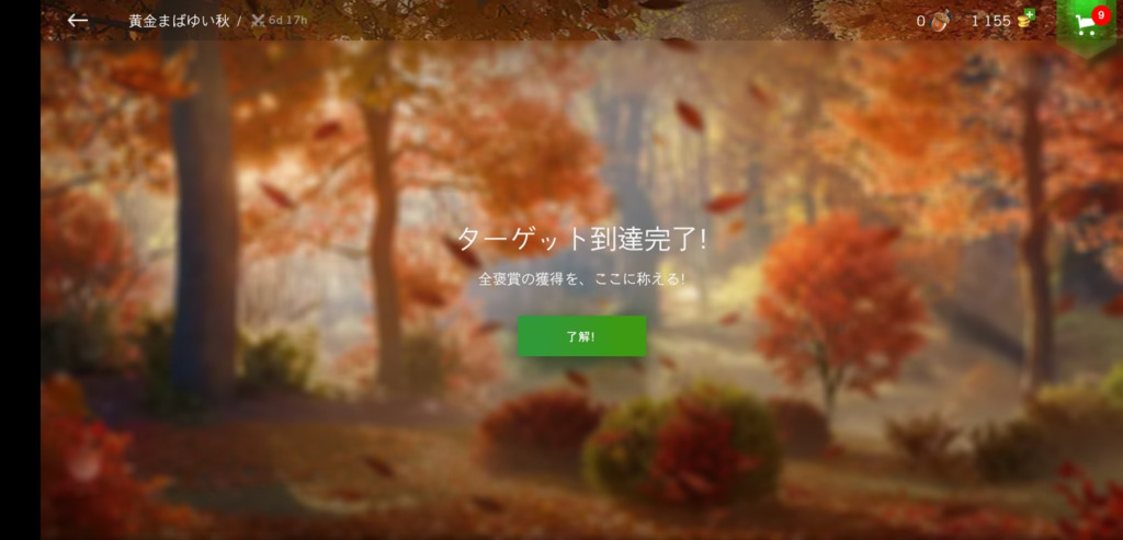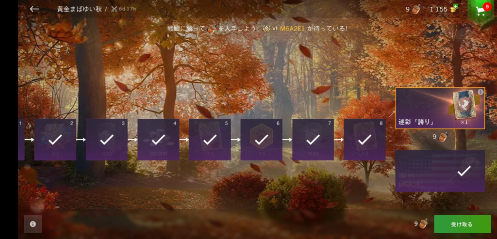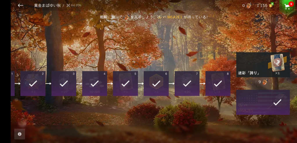 イベント「黄金まばゆい秋」車輌M6A2E1が、今日日曜日迄に取れて良かった。明日からは時間が取れないから、52勝+9勝の軽いイベントだったから良かった。